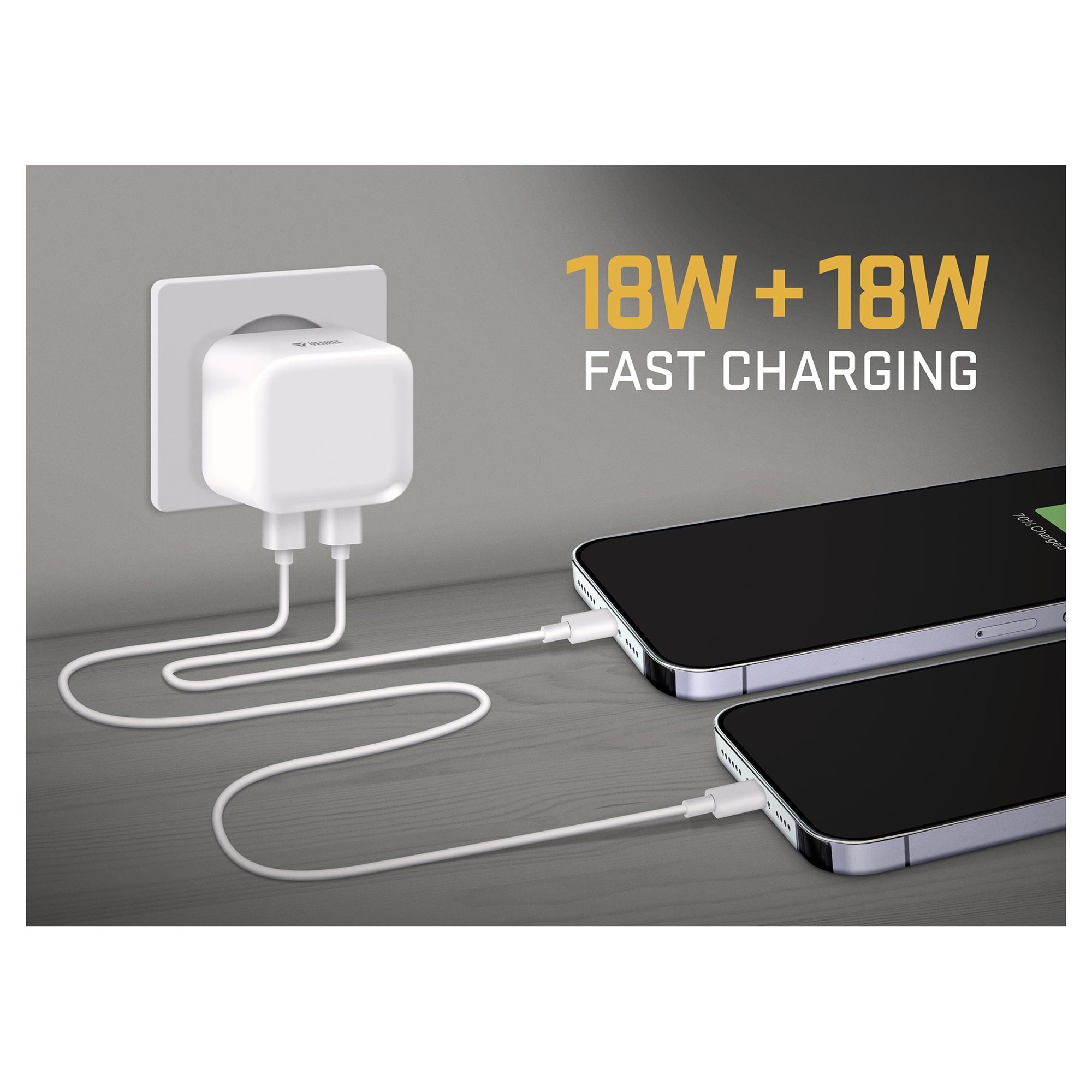 Nabíjačka YENKEE YAC 2133 disponuje dvoma USB-C výstupmi s celkovým výkonom 36 W, takže môžeš nabíjať dve zariadenia naraz. Napríklad dva mobily, dva tablety alebo mobil a tablet zároveň. V tomto prípade dodá nabíjačka YENKEE YAC 2133 každému výstupu výkon 18 W, čo je viac než dostatočné na svižné doplnenie energie.