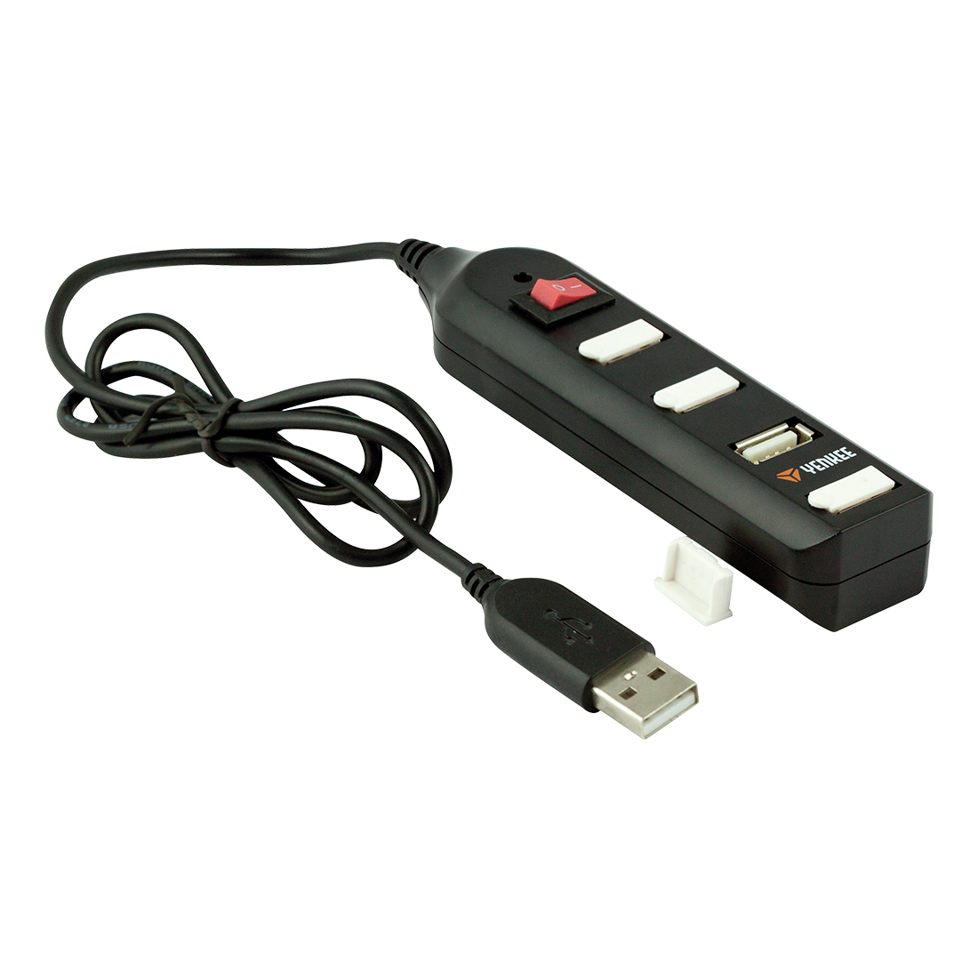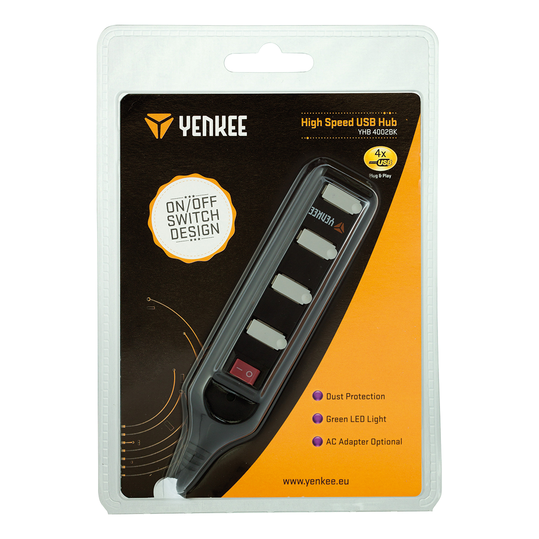 Exkluzívny štvorportový USB hub obsahujúci prachuvzdorné gumové kryty a vypínač pre jednoduché použitie a správu. Napájanie cez USB alebo v prípade potreby možno tiež použiť externý adaptér (nie je súčasťou dodávky). Zelená LED dióda signalizuje aktivitu zariadení. Nevyžaduje inštalácií (Plug & Play).