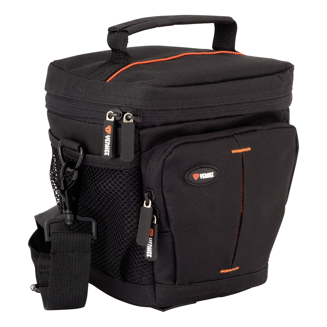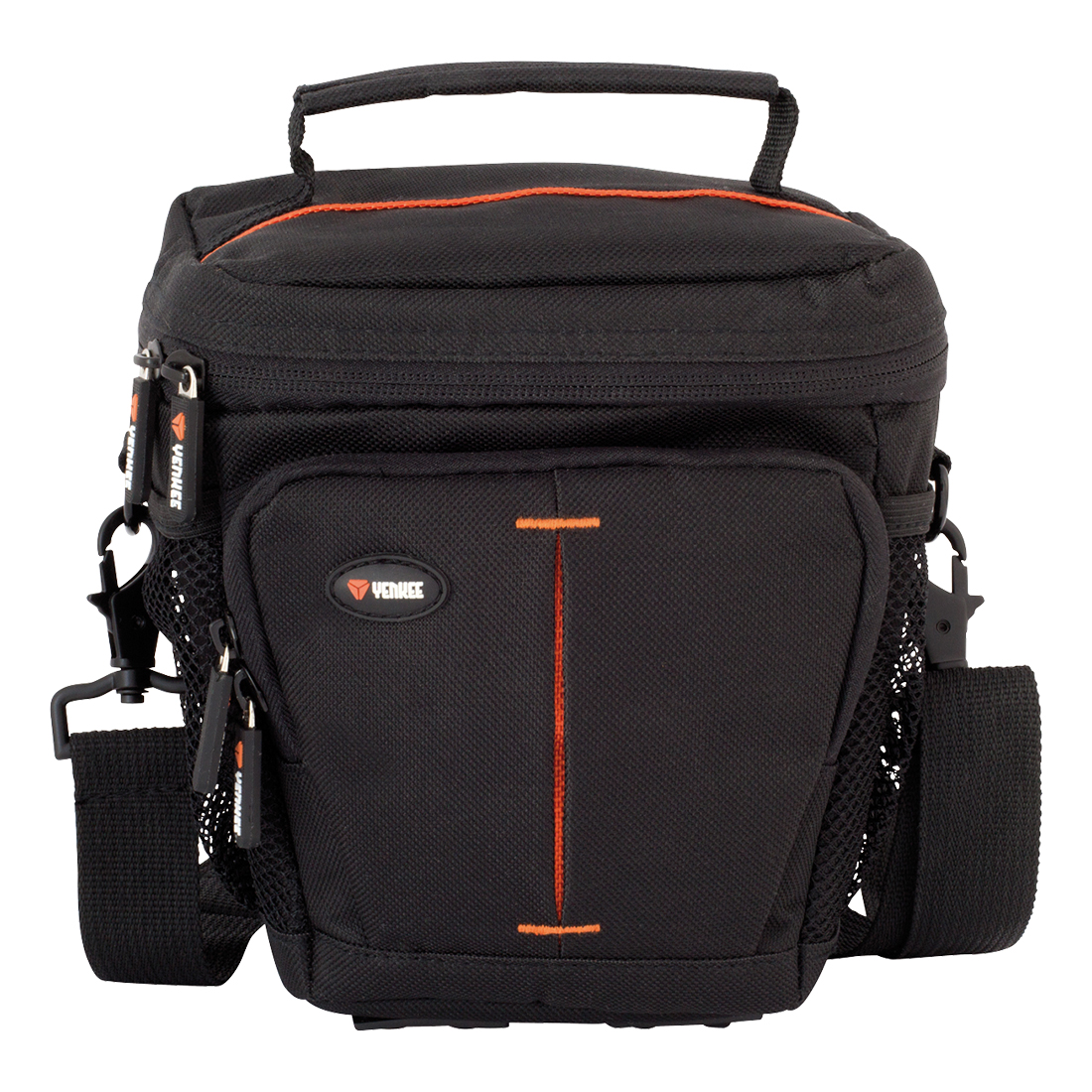 Celkom päť vreciek poskytuje dostatok miesta pre bezpečné uloženie nielen príslušenstva. Vonkajšie predné vrecko na zips je ideálne pre bezpečné uloženie dokladov a cenností a obsahuje mini puzdro na suchý zips vhodné napr. na pamäťové karty alebo náhradné akumulátory. Dve vonkajšie bočné sieťované vrecká oceníte pre uloženie káblov a drobného príslušenstva. Zosilnené vnútorné polstrovanie z jemného materiálu chráni proti poškriabaniu a zaručuje dobré zafixovanie fotoaparátu počas prenášania. Zips s dvoma pogumovanými jazdcami umožňuje rýchly a bezpečný prístup k zariadeniu.