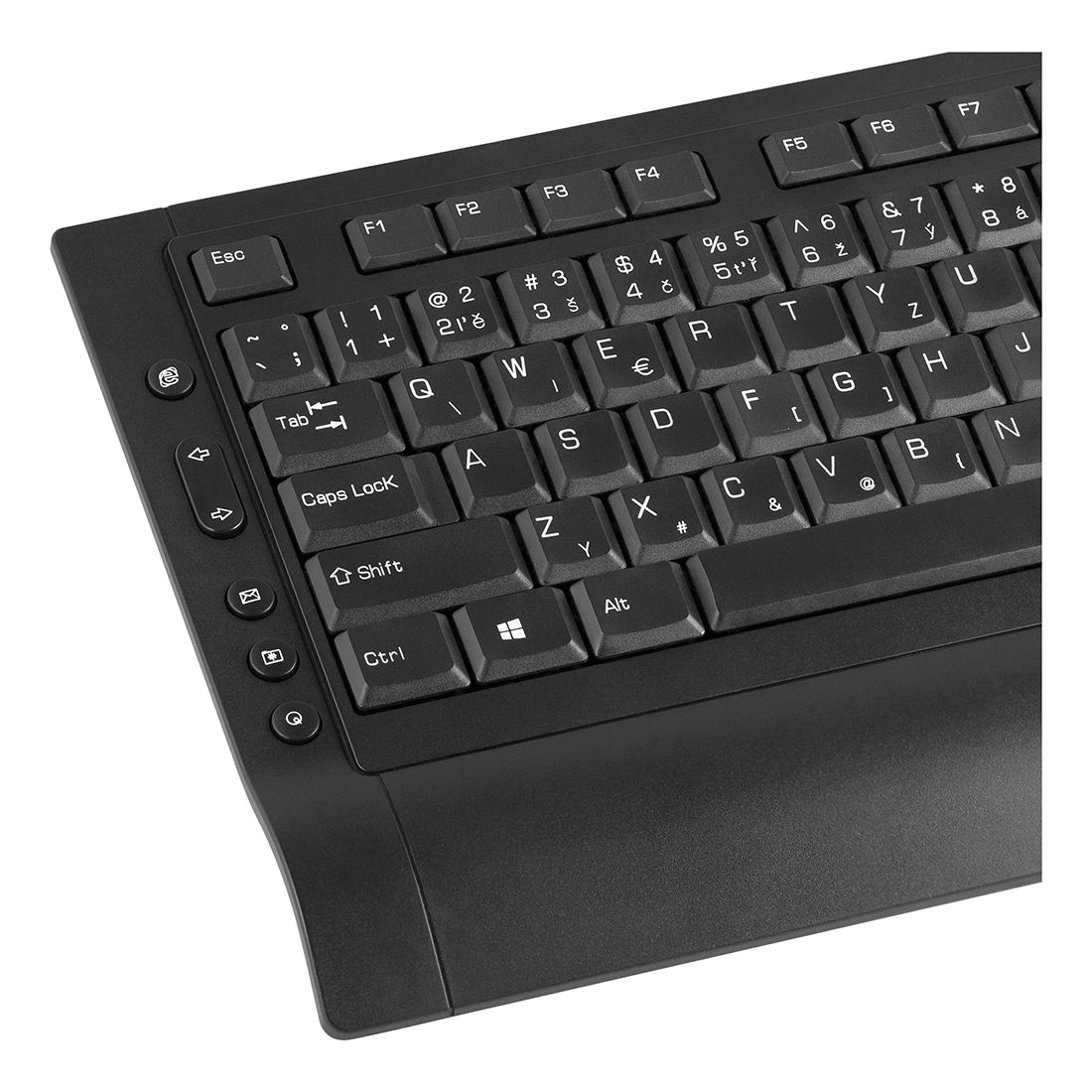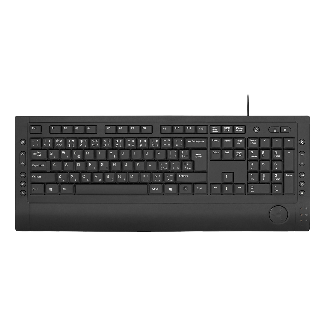 Vysoko spoľahlivá multimediálna klávesnica s funkčnými klávesami na dvoch stranách umožňuje pohodlné používanie oboma rukami. Veľká opierka zápästia a mimoriadne tenké vyhotovenie zaisťujú optimálnu a príjemnú polohu pri písaní.