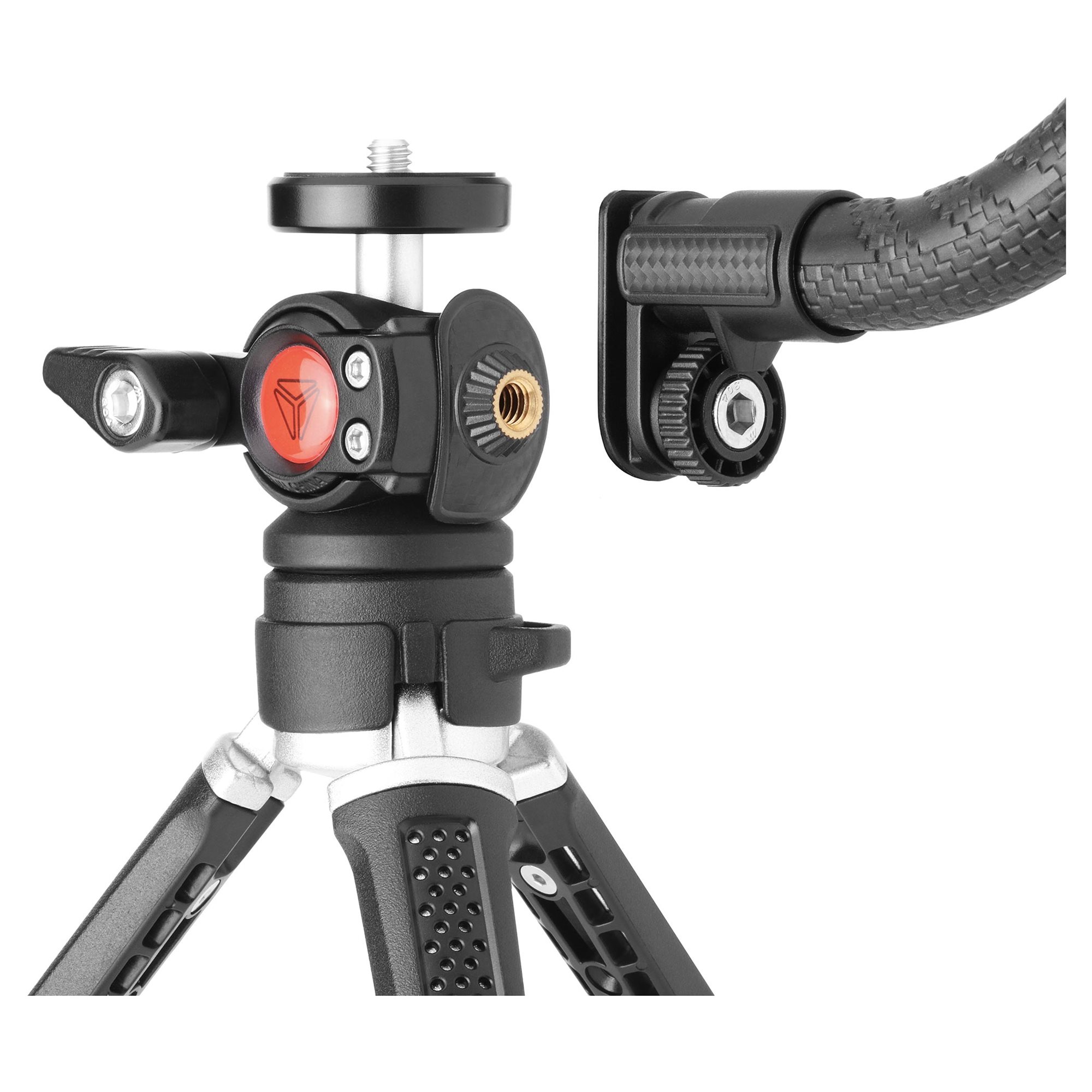 Hoci vyzerá moja konštrukcia ladne a skladne, v reáli nie som žiadne tintítko. Pri mojej výrobe bola použitá kombinácia hliníka a plastu, nech ťa podržím v každej situácii a za každých okolností. Na môj tripod teda môžeš bez obáv pripevniť videoprojektor, kameru, fotoaparát, stabilizátor alebo držiak na mobilný telefón, ktorý mi samozrejme pribalili do setu, nech s tým nemáš starosti. Okrem sily dokážem zaujať aj svojim rozhľadom. Vďaka mojej otočnej guľovej hlave a flexibilnému ramenu snímam perspektívu 360 ° v rôznych polohách.
